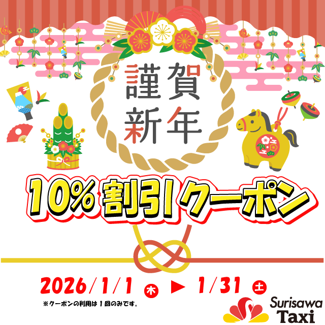 2026年1月限定クーポン配信! 2026 1/03 2026年1月1日 公式LINE友だち登録者限定で、2026年1月1日~31日の期間でご利用可能なクーポンを配信します!初詣や初売り、新年会等、外出の機会が増えるシーズンにぜひご活用ください! 2026年1月限定クーポン配信! 年末年始の営業について 12月限定クーポン配信! キャッシュレス決済について 第3弾! プレミアムタクシー乗車券の販売・利用開始!!! Homeお問い合わせサービスプライバシーポリシー採用情報摺沢タクシーについて ニュース 関連記事 年末年始の営業について 2025年12月18日 12月限定クーポン配信! 2025年12月3日 キャッシュレス決済について 2025年5月12日 第3弾! プレミアムタクシー乗車券の販売・利用開始!!! 2025年4月25日 年末年始の営業時間について 2024年12月31日 新車両とロゴマーク 2024年11月10日 公式ラインを開設しました! 2024年10月7日 Webサイトリニューアルのお知らせ 2024年10月6日